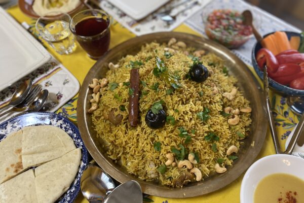 中東の中でも特にアラブ湾岸諸国に注目されているようなので、UAE、カタール、バハレーン、オマーンで食べられている米と肉の大皿料理、マチブース(=マクブース)をメインディッシュにしました。同系統の料理がサウジアラビアではカブサと呼ばれています。