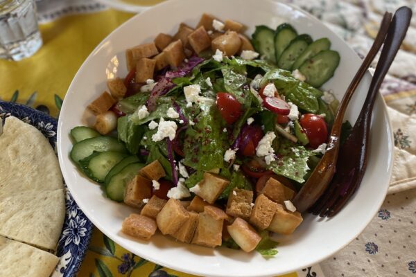 副菜はレバント地方発祥ながら湾岸諸国でもすっかり定着しているフムスやファトゥーシュ(サラダ)、豆のスープなどを作りました。