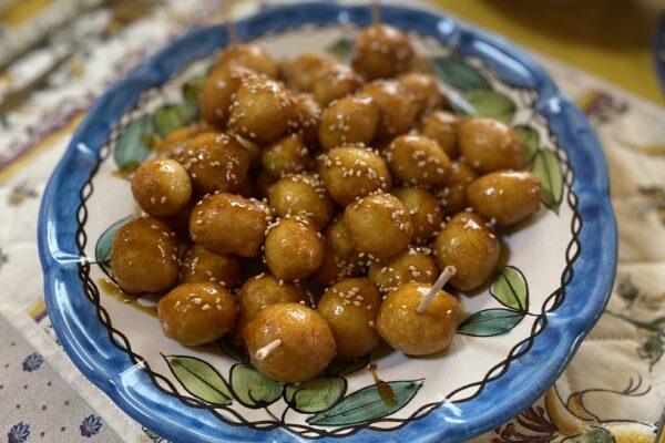 また、素朴な揚げ団子ルゲイマットをデザートに。UAEでは、デーツシロップとゴマをかけます。