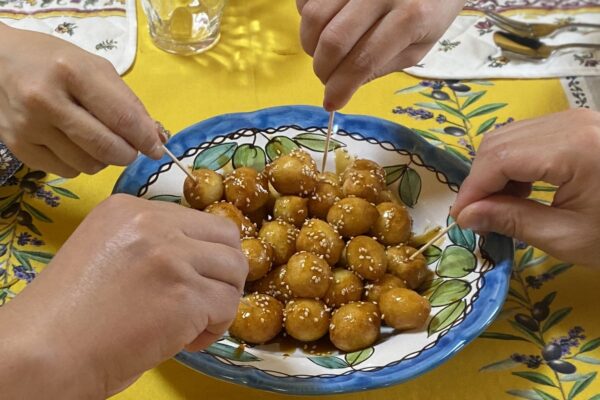 また、素朴な揚げ団子ルゲイマットをデザートに。UAEでは、デーツシロップとゴマをかけます。
