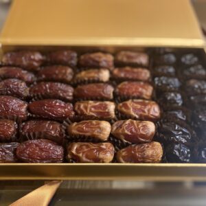 それから、アラビックコーヒーのおもてなしに必ず添えて出されるデーツ。Bateelの豪華デーツ三種詰め合わせもいただきました。Bateelはサウジアラビアの高級デーツ専門店で、UAE内にも多数の店舗があり、贈答用に人気があります。左からマジョール種、セガイ種、アジュワ種のデーツです。