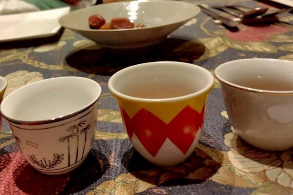 デザートには、伝統スイーツのムハラビーヤ。サウジアラビア南部でマンゴーが採れることから、マンゴーソースを控えめにかけました。それと、現代的なスイーツ、アーモンド入りデーツチョコを、温かいハバクティーとともにお出ししました。ハバクは、ホーリーバジルに似たさわやかな香りのバジルです。1/11の回では、日本国内で手に入るドライのホーリーバジルとフレッシュなスペアミント、それにサウジアラビアで買ってきたダストティーで再現しました。1/24の回では、ちょうどサウジアラビアから帰った知人が本物のドライハバクを差し入れてくれたので、それを使って本格ハバクティーを淹れました。ほかにも、ありがたいことにサウジコーヒーの粉、柔らかいスッカリ種のデーツ、チリペーストなどもいただきましたので、それらもすぐに参加者の皆様に味わっていただきました。