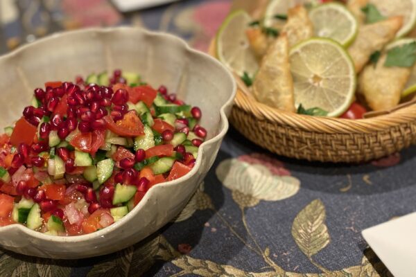 年が明けて2回、サウジ料理食事会を開催しました。サウジアラビア各地の多様性と今昔の歴史をたどる食事会になりました。伝統的なガフワ(アラビックコーヒー)とデーツのウェルカムに始まって、ひき肉のサンブーサや、朝食の定番サウジ・シャクシュカ、ジェッダのシーフードレストランを思い起こさせる天然エビのスパイシーフライなど。メイン・ディッシュはチキンのカブサです。フレッシュなトマトチリソース「ダッコス」とともに召し上がっていただきました。
