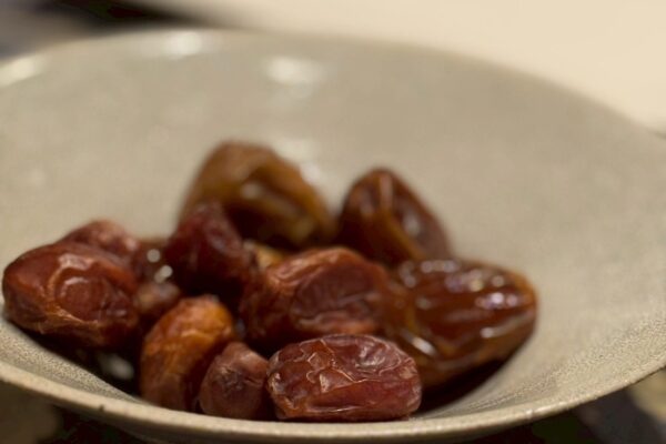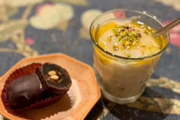 デザートには、伝統スイーツのムハラビーヤ。サウジアラビア南部でマンゴーが採れることから、マンゴーソースを控えめにかけました。それと、現代的なスイーツ、アーモンド入りデーツチョコを、温かいハバクティーとともにお出ししました。ハバクは、ホーリーバジルに似たさわやかな香りのバジルです。1/11の回では、日本国内で手に入るドライのホーリーバジルとフレッシュなスペアミント、それにサウジアラビアで買ってきたダストティーで再現しました。1/24の回では、ちょうどサウジアラビアから帰った知人が本物のドライハバクを差し入れてくれたので、それを使って本格ハバクティーを淹れました。ほかにも、ありがたいことにサウジコーヒーの粉、柔らかいスッカリ種のデーツ、チリペーストなどもいただきましたので、それらもすぐに参加者の皆様に味わっていただきました。