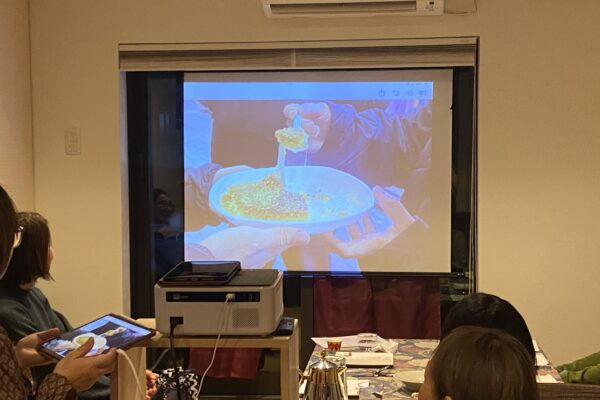 食事会の最後には、私が用意したスライド、「サウジアラビアの食をめぐる旅:家庭の味から再構築された伝統料理へ」を見ていただきました。リヤドとジェッダのおすすめレストランもいくつかご紹介しましたよ。熱心にメモを取る参加者も。リヤド万博に行く!と心に決めていらっしゃるそうです。