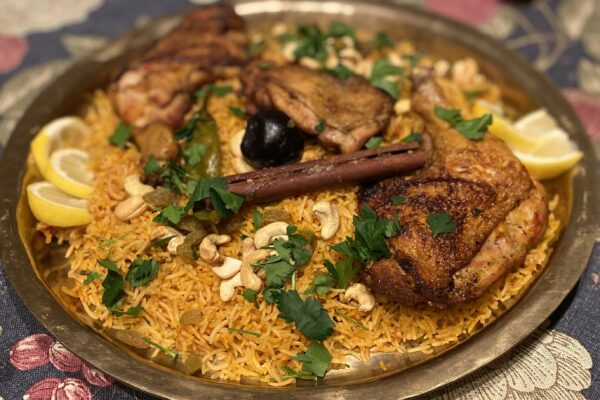 年が明けて2回、サウジ料理食事会を開催しました。サウジアラビア各地の多様性と今昔の歴史をたどる食事会になりました。伝統的なガフワ(アラビックコーヒー)とデーツのウェルカムに始まって、ひき肉のサンブーサや、朝食の定番サウジ・シャクシュカ、ジェッダのシーフードレストランを思い起こさせる天然エビのスパイシーフライなど。メイン・ディッシュはチキンのカブサです。フレッシュなトマトチリソース「ダッコス」とともに召し上がっていただきました。